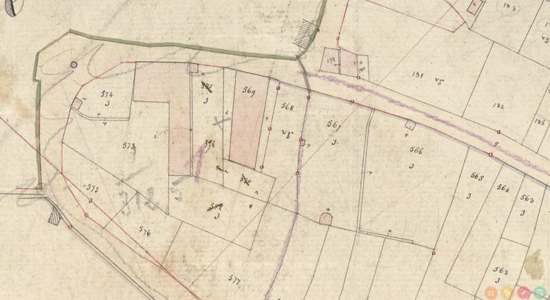 L'extrait cadastral représente le carrefour avant la construction de la tannerie (cadastre napoléonien de 1835 source archives départementales du Bas-Rhin)