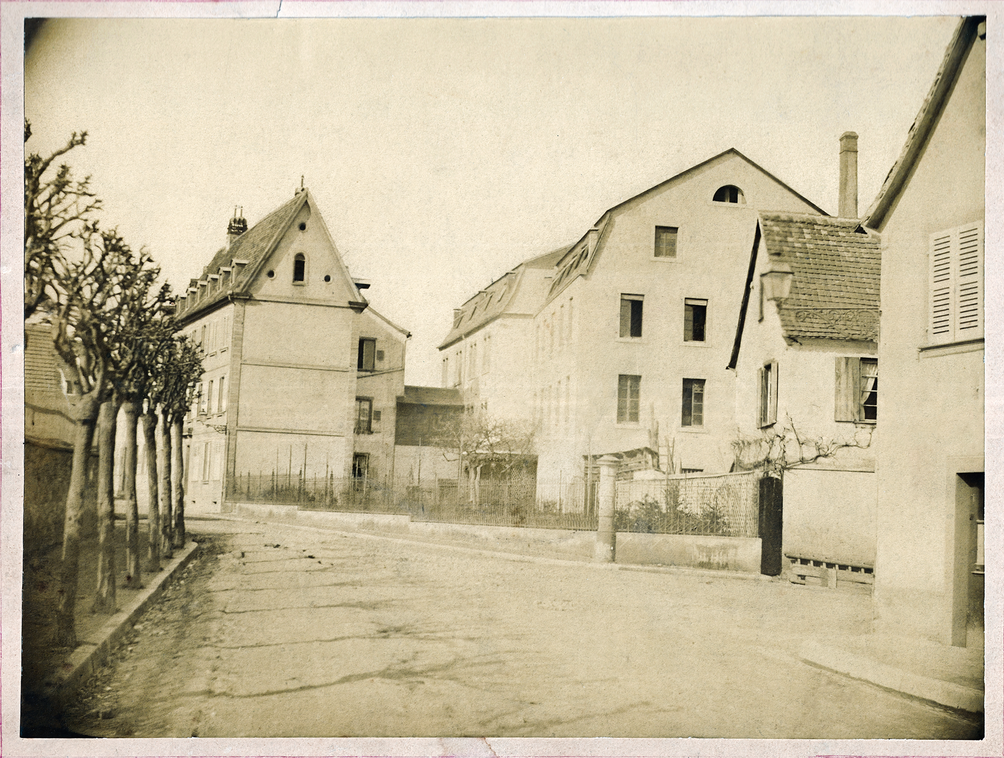 La vue représente l'actuel carrefour de la Poste. Le tronçon de rue reliant la rue du Gal Vandenberg à l'avenue Marcel Krieg n'existait pas encore. Les bâtiments en arrière plan, aujourd'hui disparus, sont ceux de la tannerie Simon, créée par Charles Simon. Il ne reste que l'immeuble d'habitation.